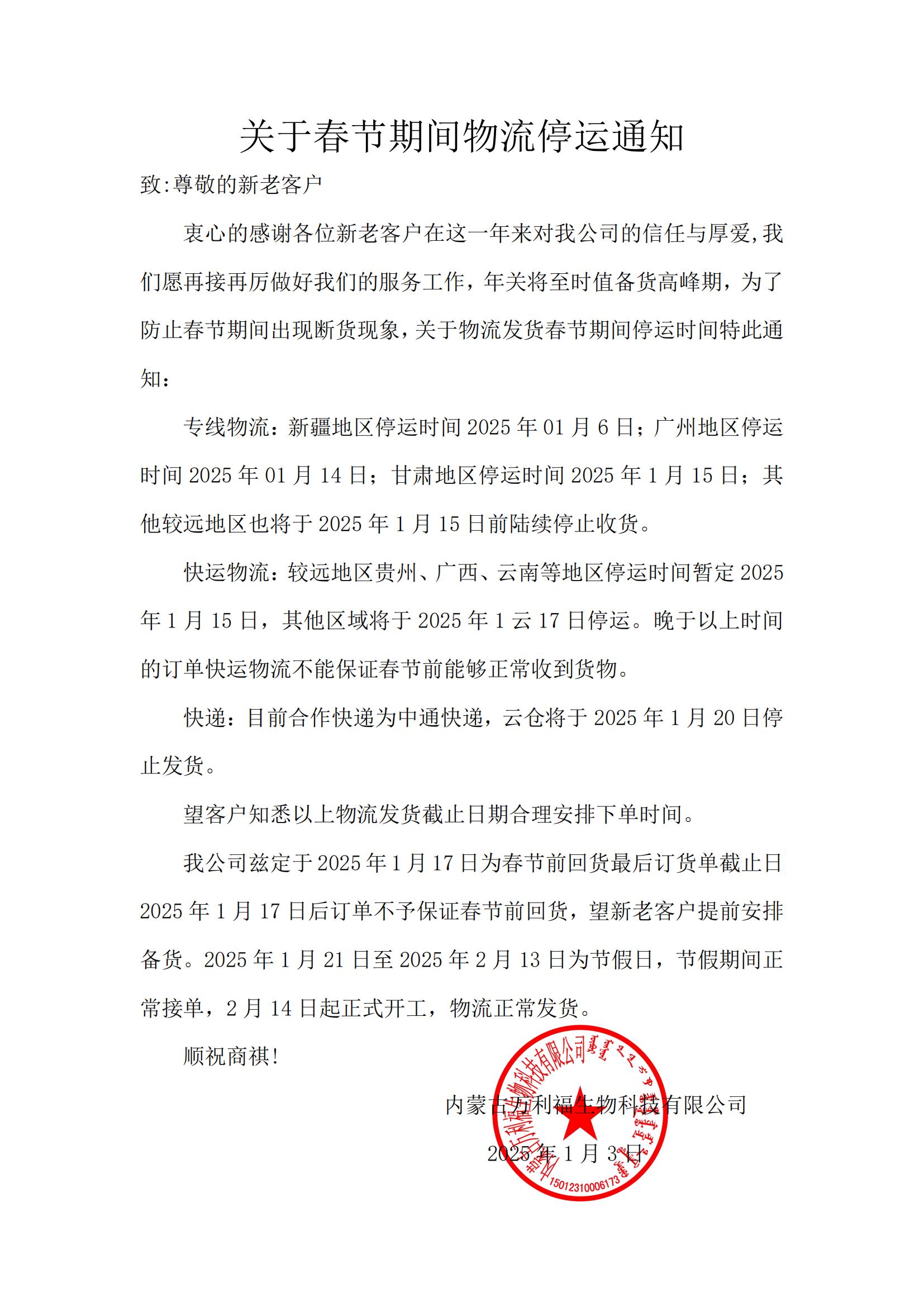 關于春節期間物流停運通知